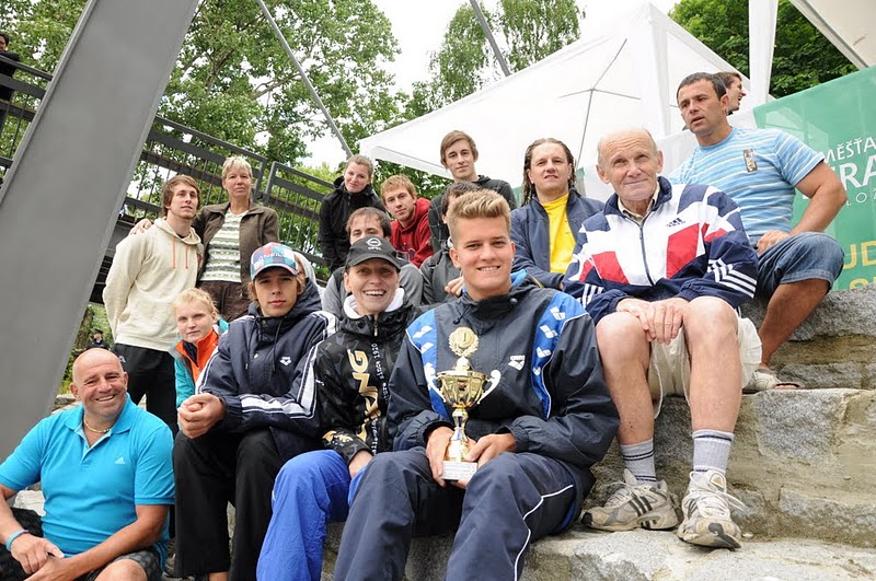 Závod ostatních (nereprezentantů) vyhrála Karolína Hlavatá (ST-TJ Fezko vodní pólo) – podala obdivuhodný výkon mohutně povzbuzována po celou trať spoluhráčkami z vodního póla. Poslední byl nestor plzeňského plavání 70tiletý MUDr. Jaroslav Novák. Všichni se již těší na pokračování v příštím roce, kdy již tento závod snad bude zařazen do série závodů Českého poháru. Na snímku (autor Pavel Dušek, stejně jako všech fotek umístěných v galerii) účastníci po doplavání včele s prvními třemi, zprava Jachno, Pechanová, Kútnik.