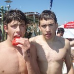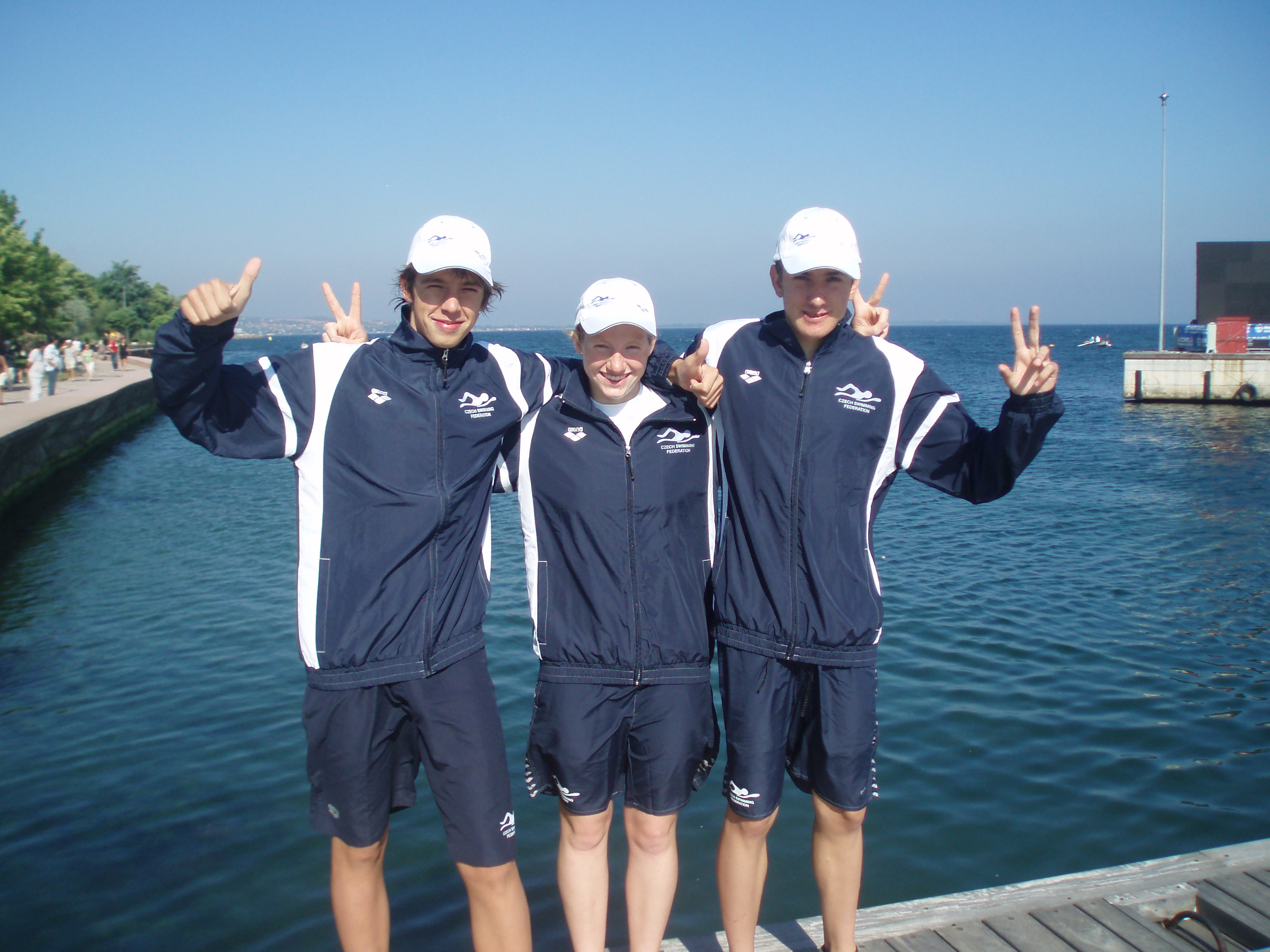 čele této skupinky vůbec neprobíhal v rukavičkách a bdělí rozhodčí udělili několik žlutých karet. Tvrdé lokty převážně německých a španělských soupeřů pocítili i oba naši zástupci kdykoliv se ve skupině pokoušeli posunout o nějaké místo dopředu. Závěrečný asi 150 metrový sprint do cíle trochu překvapivě zvládl nejlépe rakouský reprezentant Matthias Schweinzer (1:06,58), druhý doplaval Španěl Yonatan Castet a třetí Němec Hendrik Rijkens. Honza Kútnik (1:07,11) v posledním kole trochu tratil, ale výborným závěrem se vrátil na třinácté místo, Víťa Ingeduld (1:07,16) finišující z pozice na konci balíku si v cílové rovince o pár míst polepšil a dohmátnul jako sedmnáctý. V redukované kategorii plavců ročníků 1992-94, které mohou startovat na MEJ, obsadili naši zástupci slibné osmé a deváté místo (oba na druhém snímku v cíli závodu).