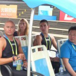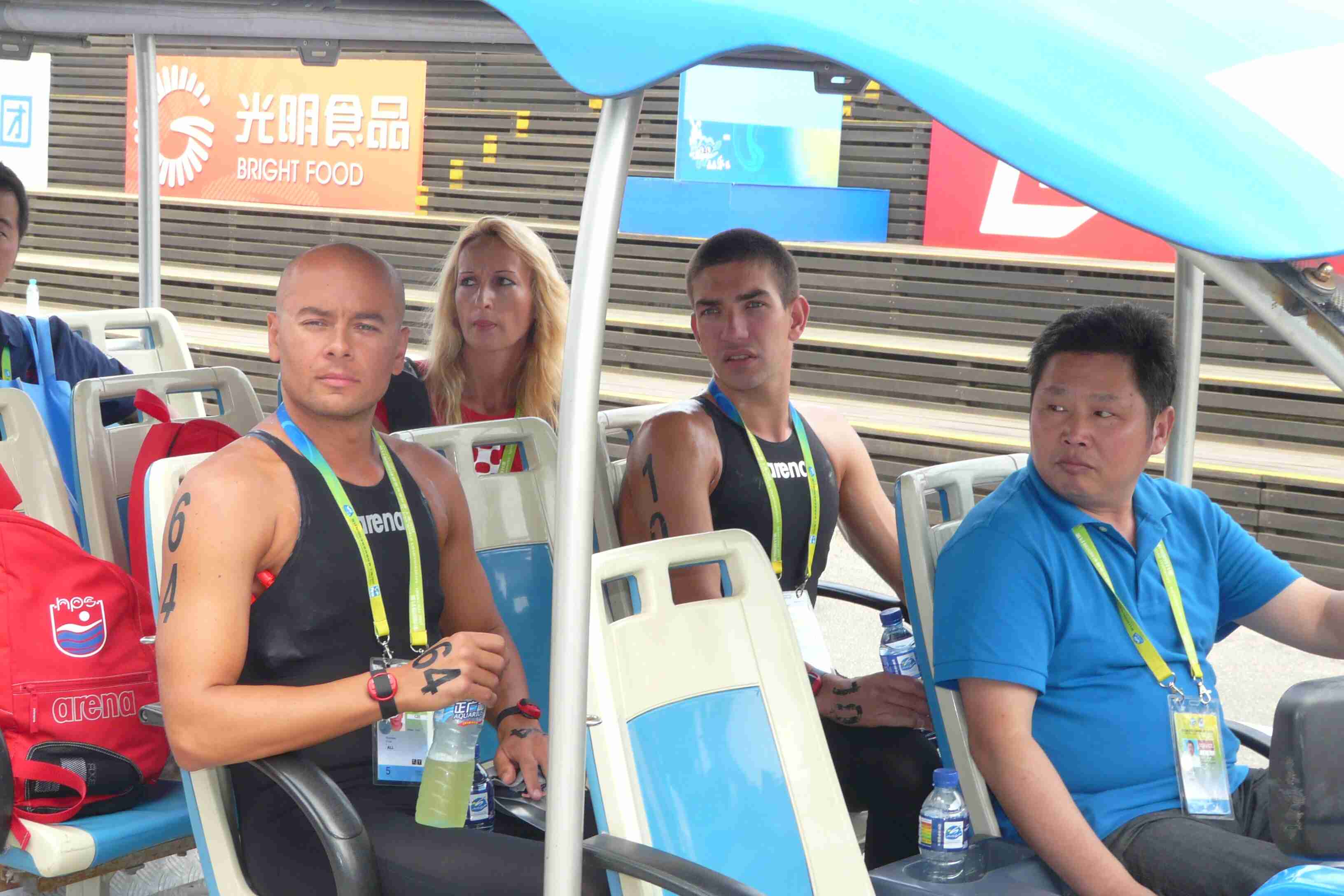 Jinak než soubojem titánů v pekelné výhni se dnešní desítka mužů nazvat nedá. Dnes nastalo bezvětří, což navléklo nad dějiště mistrovství světa deku oparu a smogu a hnalo teploty do nesnesitelných hodnot, obzvášť na sluníčku, které dnes téměř celý den přes smog a opar prosvítalo. Nebylo tedy divu, že voda před startem měla o dalších půl stupně více než včera, 29.2°C. A teplota pak každou čtvrthodinou rostla, což odvařilo řadu favoritů, kteří doplavávali ve 3., 4., 5. i 6. desítce s tím, že si svoje šance (na OH) nechají na příští rok do chladného Setubalu (Stojčev, Ferreti, Kerin, Bryan, Do Carmo, Lavrentjev atd. atd.). Až tady si člověk uvědomí, že proti sluníčku lepší než tílko je dlouhé oblečení, lepší než kšiltovka je klobouk se zástěrkou, k čemu je závěs i před obličejem a proč nosí Číňani s sebou nádoby a termosky, ve kterých louhují teplý čaj (na prvním snímku Josefa Nalezeného kluci v golfovém vozítku na cestě z 1st call roomu na startovní molo do 2nd call roomu).