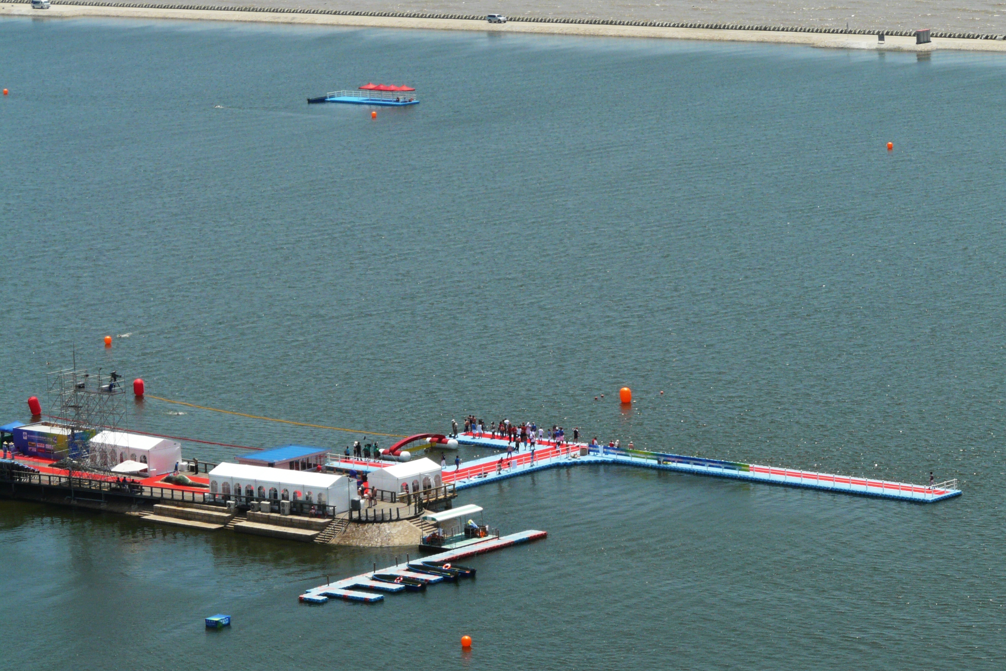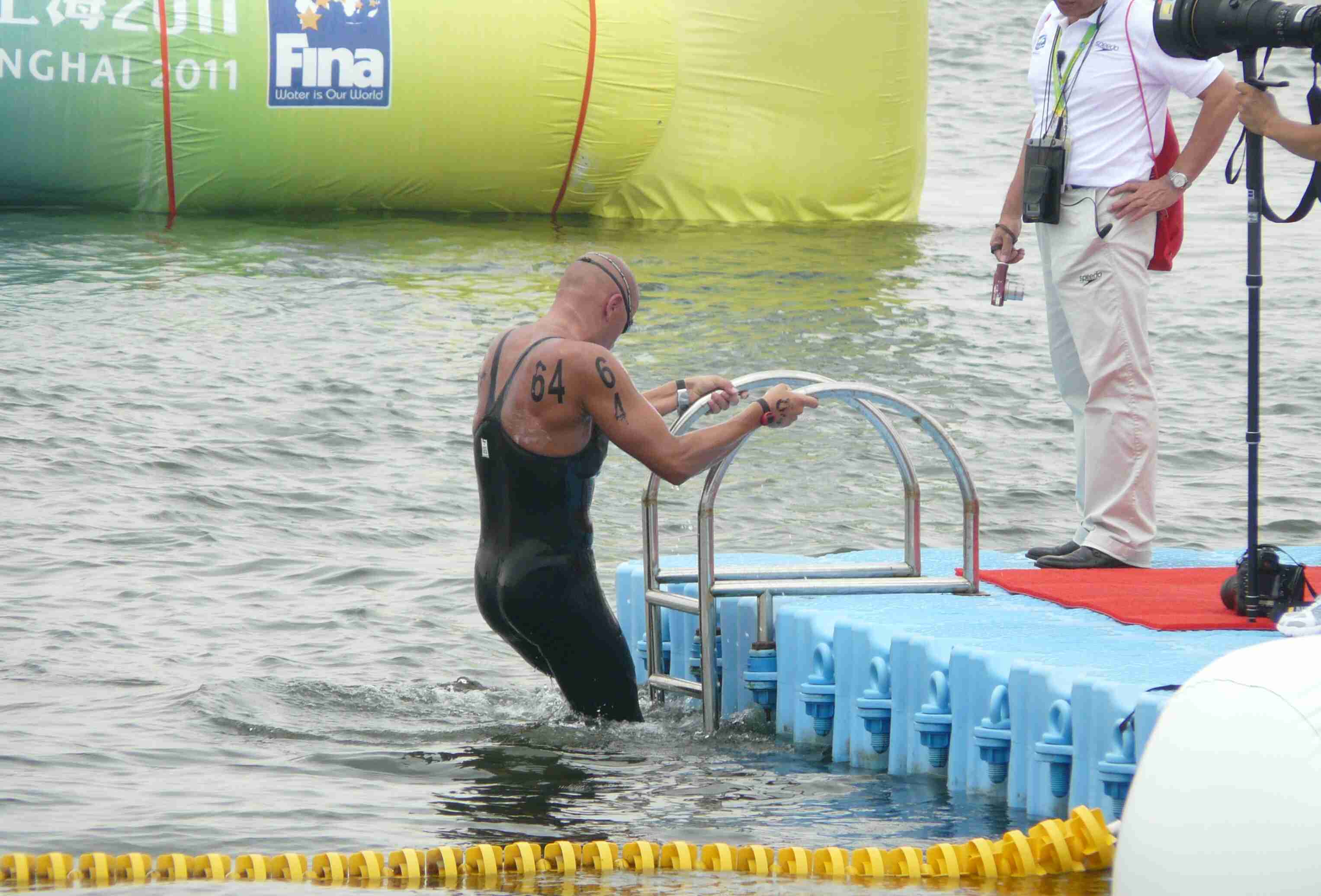V každém případě, na startu se, tak jako o den dříve mezi ženami, postavila elita, jaká se doposud nesešla. Hned 5 mistrů světa z posledních 10 let z různých tratí – Jurij Kudinov (dnes naturalizovaný Kazachstánec, ale tituly bral ještě jako Rus, ale tam je těžké se prosadit v jejich nekonečné zásobárně světových maratonců), Thomas Lurz (Německo), Alex Meyer (USA), Valerio Cleri (Itálie), Vladimír Djatčin (Rusko). K nim připočtěme vítěze světových pohárů Chada Hoda (Již. Afrika) a Petara Stojčeva (Bulharsko) a desítky dalších. Na medaile, natož na první desítku zajišťující OH si brousilo zuby 67 borců, kteří si (zpravidla) již museli šanci startu na MS a tím i šanci porvat se o OH vybojovat v těžkých domácích kvalifikacích (na druhém snímku Honza Pošmourný na startu, na třetím snímu Rosťa Vítek opouští předčasně závodní trať, na čtvrtém snímku pohled na zázemí startovního mola s malým „tréninkovým“ a „warm-up“ (250m) okruhem v popředí).