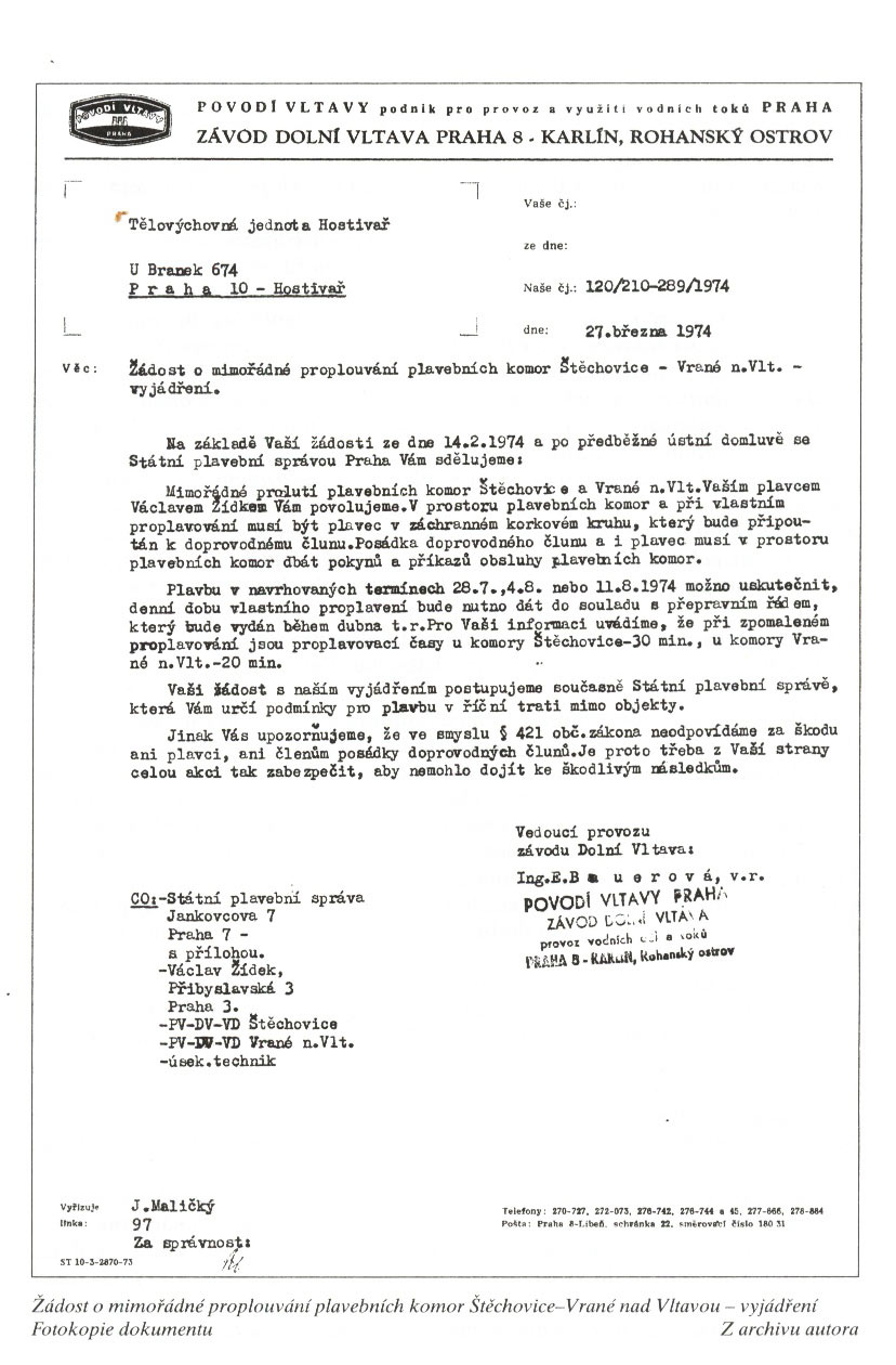 „Včera mi přišlo písmo z Povodí.“ A protože Oldřich jedl, začal jsem nahlas číst obsah dopisu: Na základě vaší žádosti ze dne 15.2. 1974 a po předběžné ústní domluvě se Státní plavební správou Praha vám sdělujeme: Mimořádné proplutí plavebních komor Štěchovice a Vrané nad Vltavou plavcem Václavem Židkem povolujeme. V prostoru plavebních komor a při vlastním proplouvání musí být plavec v záchranném krkovém kruhu, který bude připoután k doprovodnému člunu. Posádka doprovodného člunu a i plavec musí v prostoru plavebních komor dbát pokynů a příkazů obsluhy plavebních komor. Pro vaši informaci, že při zpomaleném zdýmání jsou proplouvací časy u komory Štěchovice – 30 minut, u komory Vrané nad Vltavou – 20 minut. Vaši žádost s naším vyjádřením postupujeme současně Státní palvební správě, která určí podmínky pro plavbu v říční trati mimo objekty. Jinak vás upozorňujeme, že ve smyslu § 421 Občanského zákona neodpovídáme za škodu vzniklou ani plavci, ani členům posádky a doprovodných člunů. Je proto třeba z vaší strany celou akci zabezpečit tak, aby nemohlo dojít ke škodlivým následkům. Vedoucí provozu závodu Dolní Vltava inženýrka Bauerová, vlastní rukou.