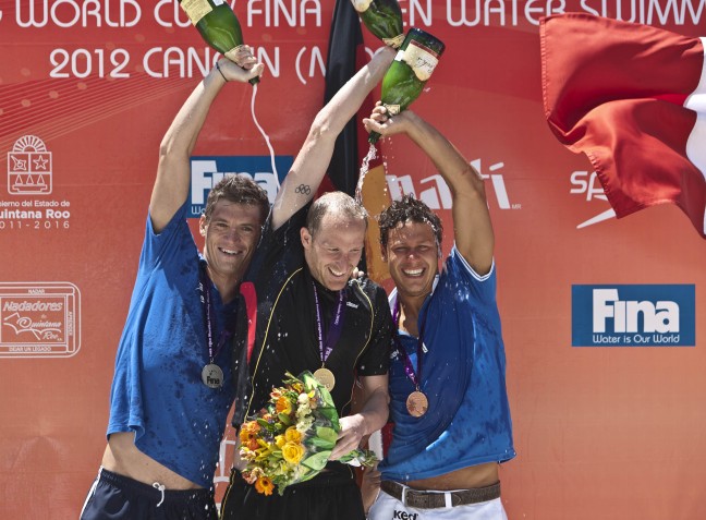 Na 8 (!) okruzích ve vlnách byl závod velice nepřehledný, což podtrhl start žen jen 5 minut za muži, takže došlo i k předjíždění. Přesto ale nakonec rozdíl mezi prvním Lurzem a druhým Řekem Gianniotisem byl tak minimální, že cílový rozhodčí museli několikrát přehrát videofiniš, než přiřkli vítězství Lurzovi. Loňský vítěz celého světového poháru vyhrál letos vůbec poprvé a přetrhl tak šňůru Gianniotise, který vyhrál všechny tři předchozí závody. Třetí místo patří Italu Bolzonellovi (všichni tři na snímku z vyhlašování vítězů). Až jedenáctý (!) skončil při své desítkářské premiéře olympijský vítěz na 1500VZ Oussama Mellouli, což ale na druhou stranu není vůbec špatné, přihlédneme-li k podmínkám a k faktu, že např. legendární Petar Stojčev, který se chce s kariérou rovněž rozloučit právě v Londýně, ho porazil jen o dohmat. Honza Pošmourný doplaval 20., Rosťa Vítek o dvě minuty za ním 25. a Libor při své letošní desítkářské premiéře 34.