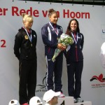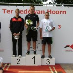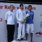 blízko břehu a vlny je zahnaly až příliš ke břehu a museli bojovat i s příbojem. Na druhém místě doplaval místní Ferry Wertmann a třetí Ital Matteo Furlan. Matěj se pokoušel chvílemi táhnout druhou skupinu a podařilo se mu utrhnout se třemi plavci. Do cíle doplaval na pěkném 19. místě a velkým překvapením bylo třetí místo mezi juniory, kdy za sebou nechal několik účastníků letošního MEJ. (Foto vyhlášení juniorů)