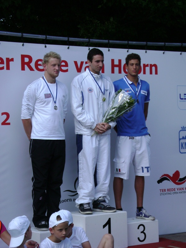 Voda i vzduch měly v sobotu 20 stupňů, ale po startu se zvednul vítr, který přinesl déšť a hlavně velké vlny, které z našich vodních ploch neznáme. Nejdříve do 5-ti dvoukilometrových okruhů odstartovali muži. Početné startovní pole se od samého začátku vlivem ostrého tempa natahovalo a po zhruba 3 kilometrech se roztrhlo na dvě hlavní skupiny. V té první asi 17 členné byl Honza Kútnik a ve druhé asi 8 členné Matěj Kozubek. Honza vydržel plavat v čelní skupině do 7 km a poté se nechal odpojit slabším Francouzem, který tempo nevydržel. Než si Honza všimnul, že je před nimi mezera, bylo pozdě a plaval na 11. místě. V konci závodu za již mohutného vlnobití ovšem předvedl vynikající finiš a dohmátl na 8. místě před juniorským mistrem Evropy z Německa Robem Muffelsem. V celkovém bodování EP po 3. kole je Honza na parádním 4. místě. Závod vyhrál izraelský plavec Yuval Safra, který jako jediný ve finiši zvolil jinou stopu dále od břehu a to se mu vyplatilo. (Foto z vyhlášení mužů) Všichni ostatní plavali