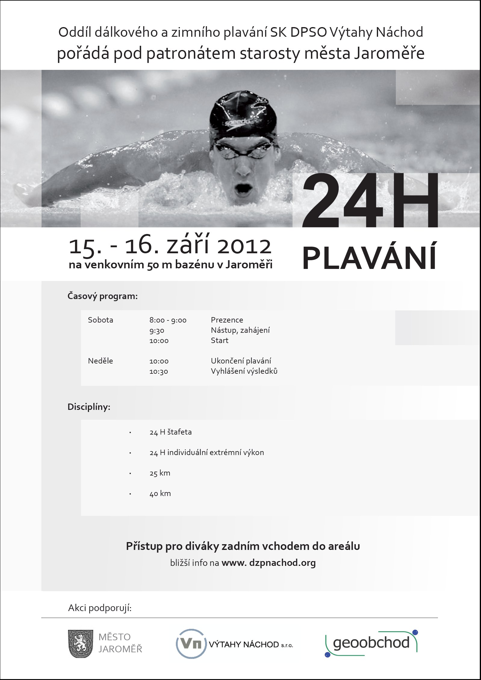 Stává se již dobrým zvykem kovaných maratonských plavců nenechat si skončit sezonu na Podzimním rožni v Mělicích, ale prodloužit si ji ještě o další týden do Jaroměře, kde se znovu uskuteční jediný extrémní ultramaraton naší termínovky – 24-hodinovka! Ta nabízí unikátní možnost zužitkovat letní naplavané kilometry ve vrcholný výkon, případně zahájit novou tréninkovou sezónu dvoudenním objemovým soustředěním, čehož využívá v rámci tréninku čím dál více klubů. Proto neváhejte a včas si rezervujte přihláškou omezenou kapacitu jaroměřského bazénu. Plavci se tradičně budou moci pokusit překonat fousaté ultrarekordy – 131,8km z 24-hodiné štafety Vyhaslé Komety Brno z roku 2004 z Náchoda, český rekord 72,0km Michala Šandy z jeho 24 hodinovky ve Vysokém Mýtě v roce 1985 (tehdy ovšem vzdal zhruba po 20 hodinách kvůli bolestem ramene), jeho český rekord 9:31 hod. na 40 km z Brna ve stejném roce, český rekord Lídy Jelínkové 10:48 z roku 1988, kdy se připravovala na svůj úspěšný pokus o přeplavání Kanálu La Manche, nebo české rekordy Rosti Vítka a Yvetty Hlaváčové na 25km z let 1999 resp. 1995. Nejmladší z rekordů je čas 12:37 hod. Davida Čecha na 50km z roku 2003, kterým přemazal předchozí zápis Michala Šandy. Plavat mohou ovšem i ti, kteří chtějí překonat své rekordy, případně sami sebe nebo se alespoň dostat v TOP žebříčku na 40 km (má již přes dvacet záznamů – ano, již skutečně tolik borců úspěšně tuto trať absolvovalo), co nejvýše. Vloni zvládli 24-hodinovku hned tři borci včele s Petrem Černým (SOPKo) s výkonem 50,5km, štafetu vyhrála Slávie Plzeň „A“ s metráží 106,2km, 40km vyhrála Magdaléna Zárubová za 17:30 hod. a 25km Simona Švandelíková za 6:42hod.