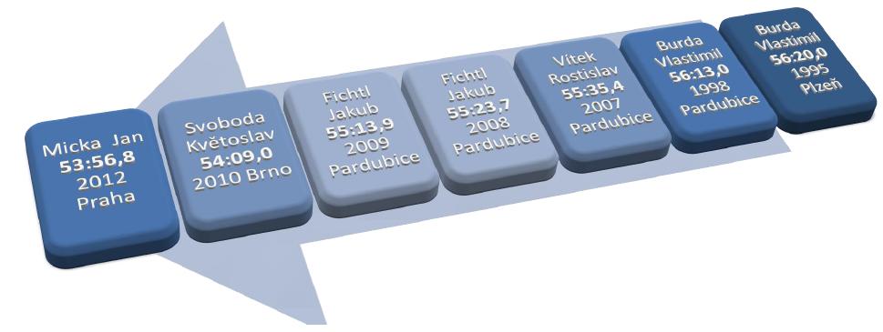 Všichni netrpělivě očekáváme nadcházející zimní mistrovství ČR v dálkovém plavání – nebo-li indoor šampionát na 5km, který již v neděli 14. dubna hostí potřetí v řadě pražské Podolí v osvědčené režii pořádajícího oddílu Bohemians. Šampionát představí naši vytrvaleckou špičku, která se utká o mistrovské tituly v hlavních kategoriích včetně kategorií žactva, tj. v mužích, ženách, starším a mladším dorostu a 14-letém a 13-letém žactvu na trati 5km a v 12-letém a 11-letém žactvu na trati 3km. Loňský ročník přinesl hned několik českých rekordů včele s tím absolutním Honzy Micky (USK) a dále žákovskými rekordy Aleny a Anny-Marie Benešových (KIN) a Petra Dostála (PKVM) a nakonec i masters rekordů Jany Pechanové (30-34) a Michaela Mrůzka (45-49). Letošní rok jistojistě představí stejně napínavou a kvalitní podívanou, která bude opět k dispozici i on-line na našem webu, a navíc, poprvé od roku 2006, kdy vyhrála Veronika Pelešková, jinou seniorskou šampiónku než Janu Pechanovou nebo Silvu Rybářovou, protože Jana má letos radostné materšké povinnosti a Silva pak ty reprezentační na světovém poháru v Mexiku. Připomeňme si poslední šampionáty v letech 2012 (Jan Micka získal titul v novém českém rekordu) a 2011 (Novými absolutními mistry ČR na 5000VZ Pošmourný a Rybářová) a rovněž se na obrázcích podívejme na vývoj českého rekordu na této distanci v posledních 20 letech.
