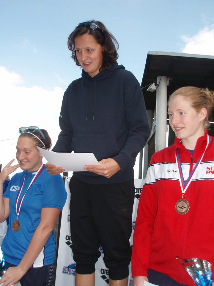 Mezi ženami jednoznačně dominovala Silva Rybářová (Kometa Brno), která nedala nikomu šanci a s velkým náskokem ukázala, co skutečně umí, a po třech stříbrech za sebou si šáhla na zlatou medaili i na pětce a přidala tak z pětky druhou zlatou k té z roku 2009. I Silva se trochu bála teploty vody, ale, jak sama po závodě řekla, byla příjemná, sluníčko pěkně hřálo a vůbec se jí plavalo dobře. No, jen tak dál, letošní Grand Prix bude ještě dlouhé. Silva zaplavala po bazénovém kontrolním startu ve Strakonicích výborně i v úvodním domácím závodě venku a porazila reprezentační i oddílovou kolegyni Báru Pickovou, která si sice polepšila po dvou bronzech na stříbro, ale v posledním kole přece jí přece jenom bylo chladněji a tak spokojeností nehýřila. Bronz vybojovala domácí Lenka Štěrbová, která za Bárou doplavala jen těsně a poslední kolo měla dokonce rychlejší (na snímku Jirky Kuřiny všechny tři seniorské medailistky).