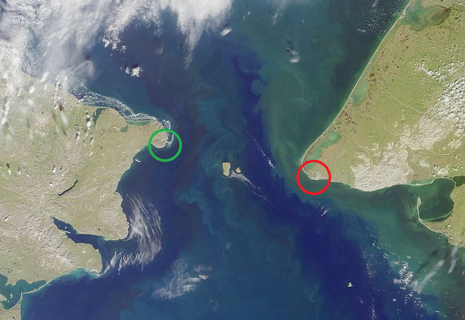 Beringova úžina je 85 km široký průliv, který spojuje Severní ledový a Tichý oceán a odděluje Asii od Ameriky. Nachází se sice jižně od severního polárního kruhu, ale zcela jasně uvnitř červencové izotermy 10°C – kterou bývá definována arktická oblast. V zimě se zde běžně vyskytují silné mrazy okolo -20 až -30°C; i v letních měsících mohou přijít mrazivé dny, průměrná teplota vzduchu v červenci a v srpnu je kolem 8°C. Teplota vody v zimě klesá na -2°C, při kterých mořská voda zamrzá. Led z vodní hladiny definitivně mizí až koncem června. Průměrná teplota vody v letních měsících se pohybuje okolo 3°C, v oblastech při pobřeží bývá asi o 5°C teplejší, zejména na východě. Silné mořské proudy v této oblasti jsou poměrně podrobně zmapovány pro účely námořní plavby a z hlediska jejich vlivu na počasí. Ví se, že proudy běžně dosahují rychlosti i přes 5 km/h a že ostrovy v úžině způsobují rozsáhlé víry a turbulence. O tom, jaký ale budou mít vliv na pohyb plavců, kteří hodlají Beringovu úžinu přeplavat napříč a jaká je nejlepší strategie pro přeplavání, donedávna nikoho nenapadlo ani přemýšlet. (obr. 1 Satelitní pohled na oblast Beringova průlivu. Na západě je Kamčatka (ruská), na východě Aljaška (americká), na severu Severní ledový oceán a na jihu Pacifik. Uprostřed leží Diomedovy ostrovy. Zeleným kolečkem je označen mys Děžňovův, na kterém se startovalo, červené kolečko značí mys Prince z Walesu, na němž byl cíl štafety. zdroj: fotografie NASA, wikipedie)
