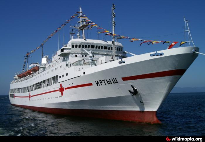 Koncem července se do Ruska sjelo přes šedesát plavců z celého světa; kromě Jacka a Elen, které jsem již zmínil, také Zdeněk Tlamicha z Prahy a Ital Paolo Chiarino, který již několikrát plaval na českých zimních soutěžích. Dorazil jeden z hlavních organizátorů Litevec Saša Jakovlev, Estonci, další Rusové, Jihoafričané, britská plavkyně Jackie Cobell, Polák Rafał Ziobro, plavci z USA, Číny, Argentiny, Chile, Irska, Austrálie a Ukrajiny. Jsou odhodláni vyplavat štafetově z Ruska, střídat se v ledové vodě v intervalech 20 minut. Předpokládají, že plaváním stráví celkem 40 až 50 hodin. Pro svůj pokus budou mít k dispozici remorkér MB-61 dlouhý 56m a jako hlavní plavidlo ruskou vojenskou námořní nemocnici, loď Irtyš (obr. 3, zdroj: wikimapia.org) s následujícími parametry: délka 152m, šířka 20m, posádka 124 námořníků, 84 zdravotnických pracovníků, 100 lůžek pro pacienty, mj. s tělocvičnou, saunou a přistávací plochou pro vrtulník. Domovským přístavem Irtyše je Vladivostok, podle jeho pásma budu uvádět všechny časové údaje (pro převod na středoevropský letní čas odpočítejte 9 hodin, pro čas platný na Aljašce odečtěte dalších 10 hodin). Vlastní doprovod plavců ve vodě a jejich odvoz z lodě a zpět budou zajišťovat tři motorové čluny – zodiaky.