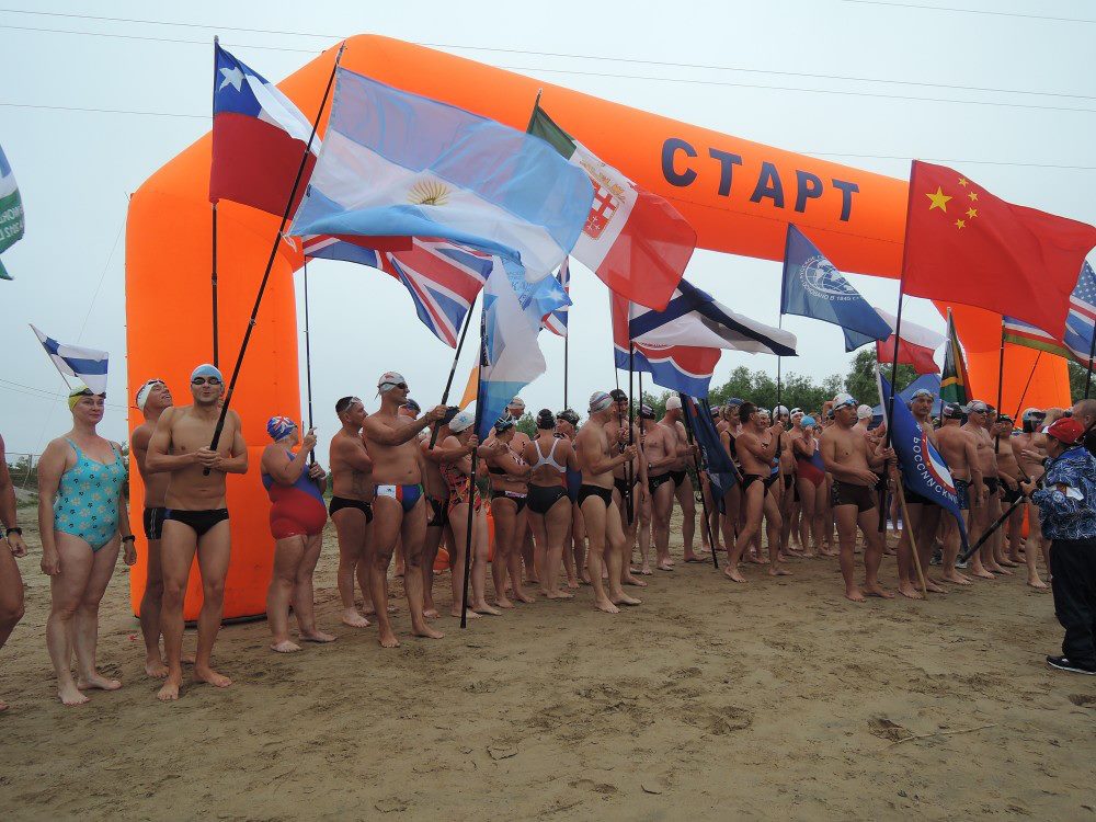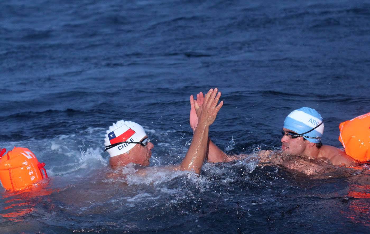 V pondělí 5. srpna 2013 v 16:24 z ruské pevniny vyplavala Američanka Melissa O’Reilly. Po 10 minutách a 650 metrech předala štafetu Rusovi Alexandru Jurkovovi plácnutím do dlaně. A pak to pokračovalo víceméně stereotypně: další tři plavci nasedli do druhého zodiaku, jejich úkolem bylo připojit se k předchozí trojici v době, kdy její třetí plavec šel do vody. Deset minut tohoto plavce doprovázely oba čluny, první plavec z druhého člunu vlezl do vody, plácnutím do dlaně převzal štafetu… a tak stále dokola. Plavci se oproti původnímu předpokladu střídají každých deset minut, dost velká zátěž je i to, že další desítky minut sedí na člunu prochladlí, promočení, ve větru a dešti, bez možnosti se zahřát běháním nebo poskakováním. Také pro obsluhu člunu je to náročný úkol. Jednak musí správně plavce nasměrovat a hlavně jej pokud možno vůbec nespustit z očí. Když se přece jen ztratí ve vlnách, musí jej nalézt – což taky nemusí být úplně snadné, přestože jsou plavci vybaveni jasně oranžovou bójkou. Ta plavání v poryvech větru a ve vlnách spíše komplikuje. Možná by pomohla, pokud by měl některý z plavců vážný problém, ale pravidla plavecké štafety to zapovídají a znamenalo by to konec pokusu. (obr. 6 Předávka štafety plácnutím do dlaní mezi dvěma jihoamerickými plavci. Zdroj: Facebook, autor Guilllermo Gallishaw)