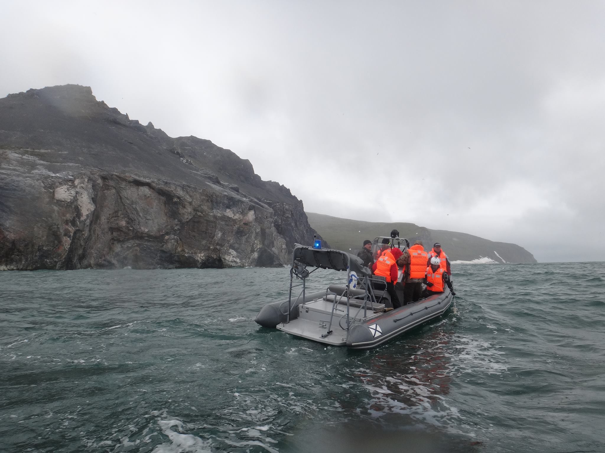 Poprvé byli plavci zaskočeni vývojem událostí dříve, než vůbec začali plavat. Po čtyřech dnech plavby na Irtyši dorazili do zátoky Providenia. Očekávali, že budou moci navštívit několikatisícové městečko, bývalý vojenský přístav Providenia, a nakoupit si ještě nějaké zásoby. Rádi by se prošli po pevné zemi, přestože počasí nebylo moc přívětivé. Bohužel, potřebné povolení k výstupu na pevninu nebylo na lodi k dispozici. Po dalších deseti hodinách plavby dorazila expedice na Děžňovův mys, nejvýchodnější pevninský výběžek Asie. Na člunech se někteří vydali prozkoumat terén, najít místo vhodné k vyplavání. Jiný člun vyvezl několik plavců na moře, aby se prakticky zjistilo, jak jsou unášeni proudem. Diskuze na téma, jaký zvolit kurs a strategii, byly složité. Chyběl někdo, kdo by tento plavecký terén znal aspoň zlomkem tak, jak ten svůj mají v malíčku lodivodi na La Manchi. Radil i kite-surfař, který Bering překonal před dvěma lety … Čekalo se na lepší počasí, než bylo rozhodnuto odstartovat. (obr. 5 Průzkum terénu na jednom z člunů poblíž místa startu, u Děžňovova mysu. Zdroj: Facebook, autor Bering Strait Swim – Russia to America)