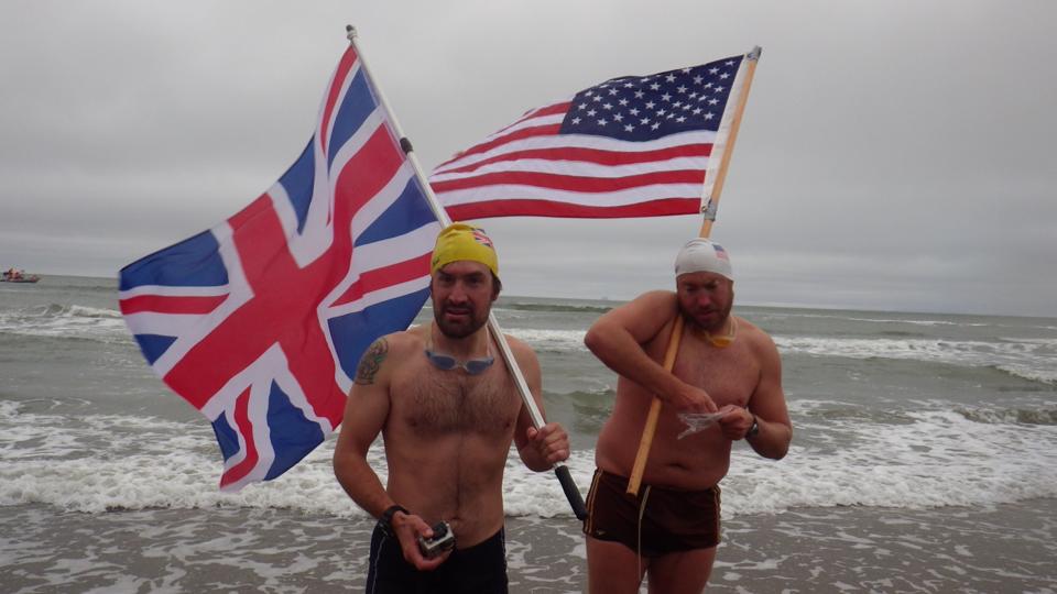 Objevují se ale další komplikace. Především se náhle mění směr a síla proudění. Pokud je rychlost proudu 2 km/h, je stále přibližně třicet plavců schopných se s proudem rvát a postupovat k cíli, byť pomalu. Ale v některých chvílích je síla proudění i několikanásobně vyšší. Směr je kamsi do oceánu a odhadované hodnoty rychlosti jsou i přes 10 km/h. (Není možné to vyhodnotit tak snadno, jako na vltavském nábřeží – hodit klacek do vody a odkrokovat, jakou vzdálenost urazí za minutu; ale méně než cca 6-8 km/h to v nejhorších chvílích bohužel zcela jistě není.) Kromě toho některým plavcům končí povolení k pobytu v Rusku, lodi Irtyš vypršelo povolení k plavbě v amerických vodách, někteří plavci by alespoň potřebovali dát vědět, že se zdrží a přijdou do práce později, argentinská výprava nestihne svatbu dcery jednoho z nich… Dochází vše, i zásoby jídla a vody. Hrozí, že se nebude možné osprchovat už ani studenou vodou, pokud má zůstat dostatek vody na pití. Bylo by možné poslat remorkér, aby doplnil zásoby, ale bylo by nutné získat souhlas k návštěvě asi 100 km vzdáleného přístavu v Nome a zabralo by to hodně času. (obr. 8 Jack Bright a Craig Lenning krátce po doplavání štafety, poblíž městečka Wales, AK. Zdroj: Facebook, autor Jackie Cobell)