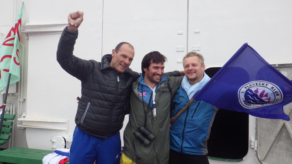 Kapitánovi lodi se povedlo prodloužit povolení k plavbě v amerických vodách. To je podstatné. Všichni již ztrácejí pojem o čase. Trvalo snad přes padesát hodin, než se štafeta přiblížila na 10 km od amerického břehu. Původně se předpokládalo, že nejdéle za padesát hodin bude odplaváno celých 85 km. A skutečnost? Za posledních padesát hodin štafeta odplavala deset kilometrů, a dalších deset ještě zbývá. V silných proudech se střídá 21 nejsilnějších plavců, občas se přes veškeré úsilí stejně stane, že se břeh Aljašky vůbec nepřibližuje nebo se dokonce vzdaluje. Ve chvílích volna plavci nabírají energii, vymýšlejí strategie, snaží se zapomenout na stres a problémy. Když jdou do vody, napínají síly naplno, aby co nejdříve dosáhli cíle. (obr. 9 Zleva: Paolo Chiarino, Jack Bright a Zdeněk Tlamicha, po úspěšném doplavání štafety z Kamčatky na Aljašku, srpen 2013. Zdroj: Facebook, autor Jackie Cobell)
