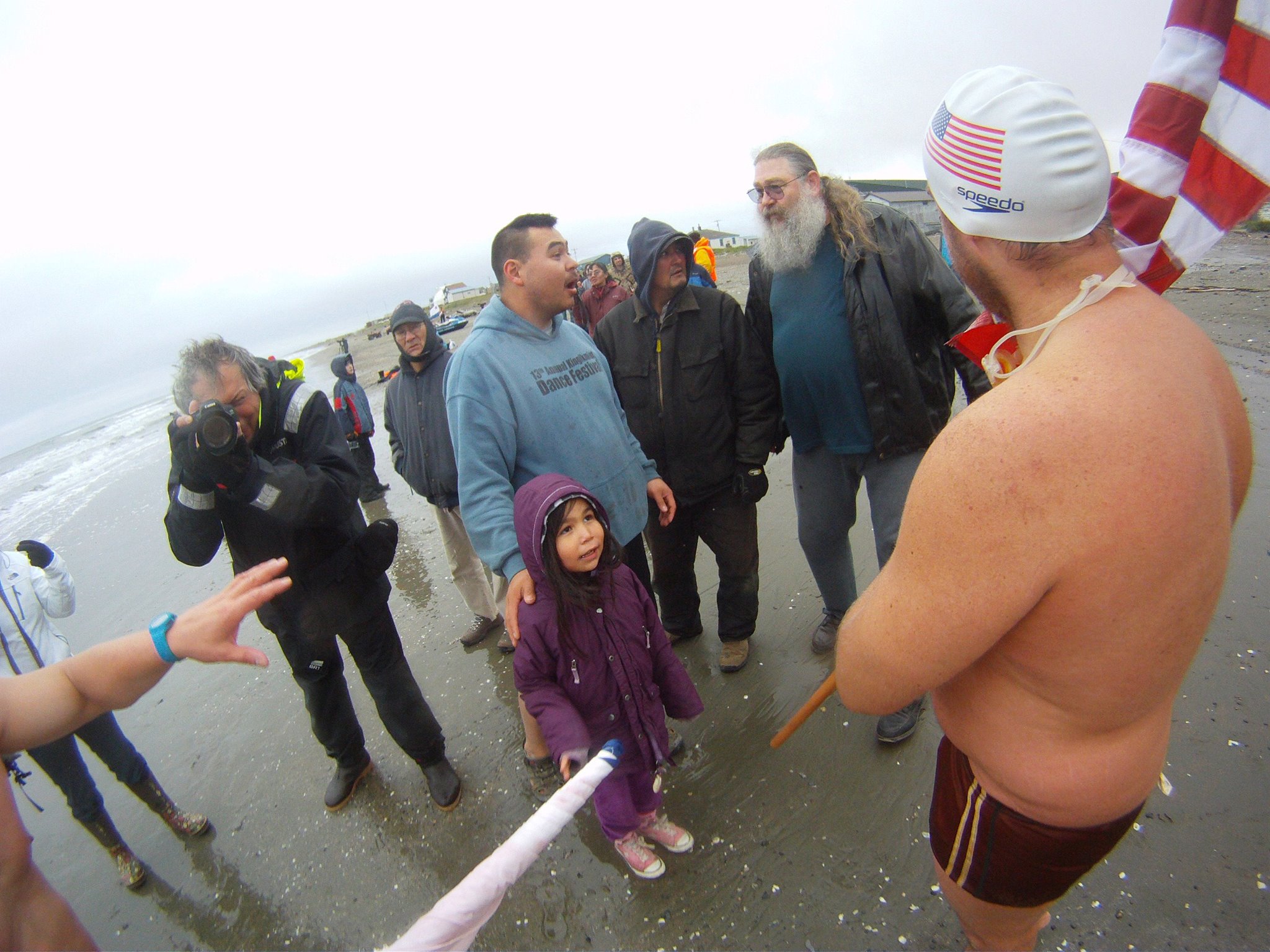 V neděli 11. srpna 2013 okolo 16. hodiny Vladivostockého času, tj. v sobotu 10. srpna ve 21 hodin večer místního času, se štafeta konečně přiblížila na 250m od břehu Aljašky. Je rozhodnuto, že jako první na pevninu u města Wales na mysu Prince z Walesu doplave Rus Oleg Dokučajev, s ním Američan Craig Lenning a potom další plavci s vlajkami svých zemí. V 16:32 štafeta dosáhla cíle. V Beringově průlivu plavci strávili 144 hodin a 8 minut, celkem uplavali 134 kilometrů. Změnila se historie, další kousek vody na planetě Zemi se lidem podařilo přeplavat. (obr. 10 Setkání obyvatel města Nome na Aljašce s otužilci po dokončení štafety. Zdroj: Facebook, autor Jack Bright)