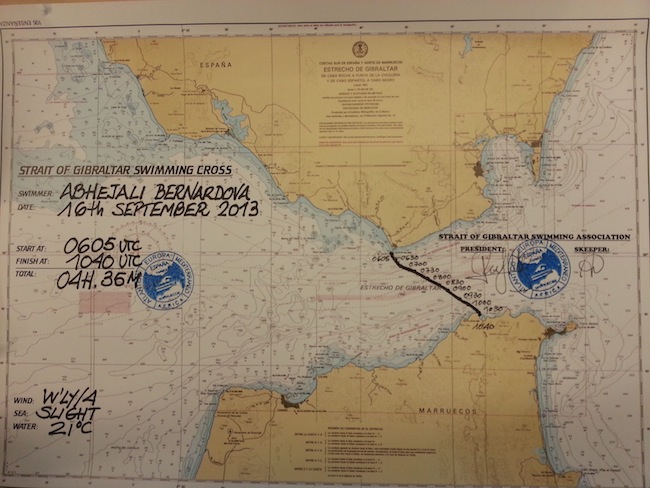 Abhejali Bernardová (foto Sri Chinmoy Marathon Team) přeplavala 16.září jako třetí Češka z Evropy do Afriky přes úžinu Gibraltar. Před ní a to již před 20 lety úžinu zdolaly Jana Zavadilová a Bronislava Paďourová. Trasu ze Španělska do Maroka dlouhou přibližně 18km urazila šestatřicetiletá vegetariánka ze Zlína za 4:35 hod. (vysokomýtské holky před 20 lety plavaly za 4:47), čímž dosáhla nejlepšího českého ženského času, přestože ji na trati vedle pověstných delfínů provázely i stejně pověstné silné proudy a vítr 3-4 Bft. Úžina je v nejužším místě široká 14,4 km (8 mil), ale plavci musí překonat silné proudění vody z Atlantského oceánu do Středozemního moře, frekventovanou lodní dopravu a téměř nepřetržitý vítr (300 dní v roce), takže překonání se rozhodně nepovažuje za lehké, byť jsou „Herkukovy sloupy“ tou kratší úžinou (většina pokusů měří 18,5-22km).