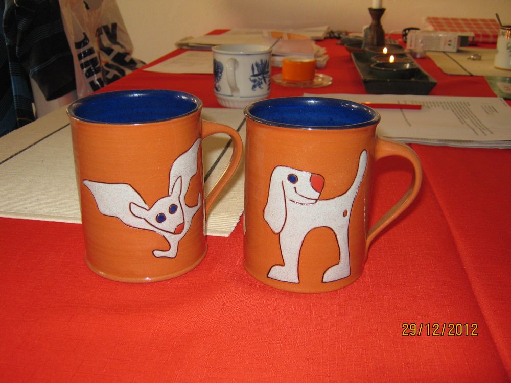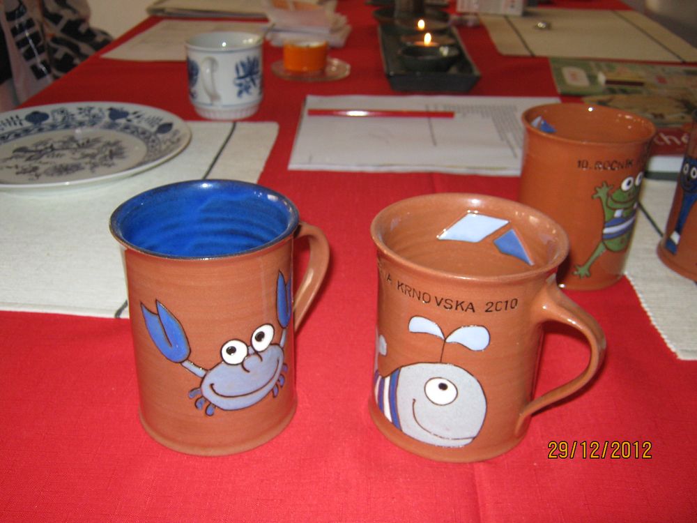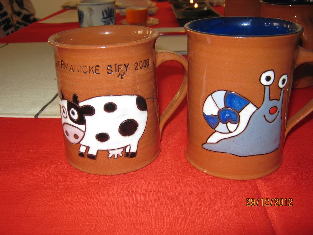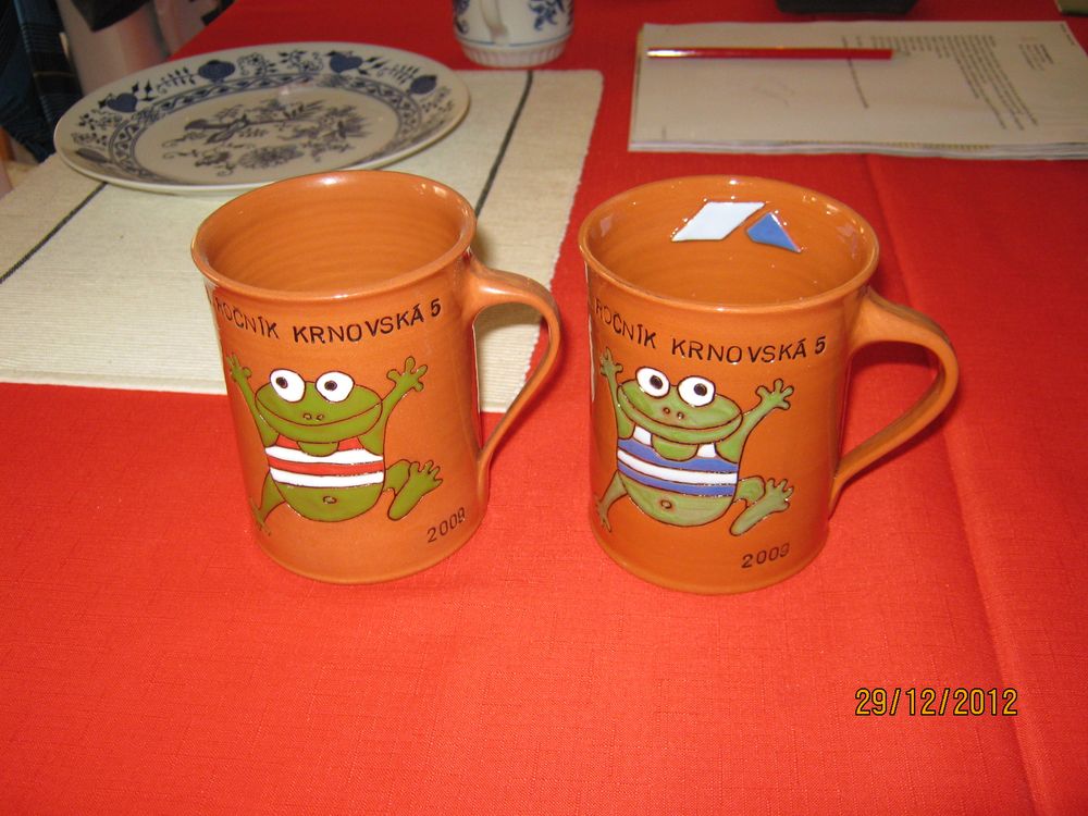Letos nám naše kamarádka výtvarnice Zuzka připravila hrníčky s hrochem. Pro závody v Krnově už takové a jim podobné hrníčky vyrábí už skoro deset let. Za tu dobu se na nich vystřídaly následující motivy: pták/kočka, netopýr/pes, šnek, pravolevá kráva (Šífry), žába červená a modrá, žába (Šífry), velryba, vosa, pulec/ryba (nebo ryby), fotky níže v článku. Pokud se mezi vámi najde někdo takový, kdo vlastní všechny motivy, nechť dá vědět a bude veřejně pochválen před nastoupenými hrníčky.