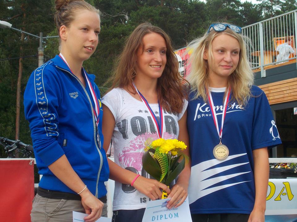 Během minulého slunečného víkendu se v Plzni na Boleveckém rybníku, na pláži Ostende, konaly dálkoplavecké závody. V jejich rámci se uskutečnilo Mistrovství ČR na 5 km intervalovou metodou a MČR na 10km s hromadným startem. V sobotu vše v Plzni začalo závodem žáků na 3 a 5 km a pokračovalo závody veřejnosti na 148 metrů, kde se představilo přes třicet plavců. Do mistrovského závodu na 5 km jsme obdrželi přes 110 přihlášek, ale nakonec startovalo 95 plavců. Závod probíhal se strachem z možné bouřky, která hrozila ze severní i jižní strany, ale nakonec v místě závodu až do jeho skončení zůstalo víceméně slunečné počasí. Plavcům znepříjemňoval závod pouze silnější vítr. Plavala se čtyři kola o délce 1250 metrů. Po prvním kole byl ve vedení o několik sekund Jakub Tobiáš, ale postupem času se rozdíly mezi nejlepšími zmenšovaly a v cíli se nakonec z lehce překvapivého vítězství radoval Karel Baloun (KomBr). Ten jako jediný pokořil hranici 55 minut a po mírném útlumu jsme ho viděli opět na nejvyšších stupíncích. Na druhém místě finišoval Vít Ingeduld a bronzovou příčku obsadil Jakub Tobiáš (oba KomBr, všichni tři na druhém snímku Z.Tobiáše). U žen byl závod nakonec překvapivě jednoznačnou záležitostí. Pro první místo si doplavala Silvie Rybářová (vítězka Celkového pořadí World Grand Prix 2014), před oddílovou kolegyní Bárou Pickovou (KomBr) a stále ještě mladší dorostenkou Míšou Štěrbovu (SCPAP).