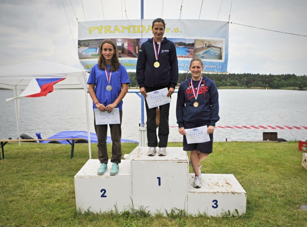 O den později se plavala mistrovská desítka, klasickým způsobem společného startu a taktické bitvy po celou dobu této maratónské tratě. A tam se rovněž zúročovaly zkušenosti. Zlatou medaili vybojovali Ján Kútnik (Kometa Brno) před znovu stříbrným Vítem Ingeduldem a znovu bronzovým Matějem Kozubkem a Lenka Štěrbová před znovu stříbrnou Alenou Benešovou, které se tak nepodařilo obhájit loňský titul, a znovu bronzovou Bárou Pickovou (na snímku R. Táborského při slavnostní ceremonii). Kútnik dokázal obhájit na olympijské trati potřetí v řadě a Štěrbová se vrátila na stupeň nejvyšší po sedmi letech, když zlatou medaili přidá doma k tomu z Lipna z roku 2009. V kategorii starších juniorů obhájili Jiří Landsman (USK) a alespoň v této kategorii Alena Benešová. V kategorii mladší brala druhé zlato Pavlína Soukupová a první Josef Knotek (SCPAP).