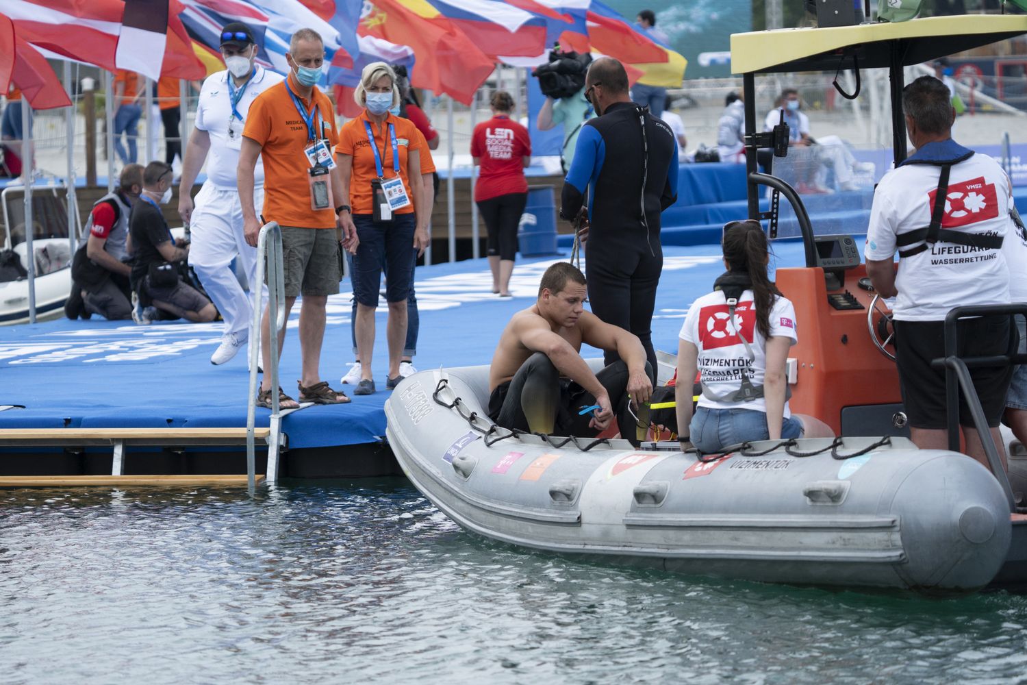 Po ženách přišli na řadu také muži. Mezi pětadvaceti startujícími byla opět trojice českých reprezentantů. Teplota vody se pro mužský závod vyšplhala přes 18 stupňů, což, dle pravidel, znamenalo, že použití neoprenu bylo na rozhodnutí samotných plavců. Na startu se ale nakonec bez neoprenu objevil pouze úřadující světový šampión na 10 km Florian Wellbrock. Z naší trojice se nejkratší dobu v závodě prezentoval čtvrtý z posledního Mistrovství světa na této trati Matěj Kozubek. Silná bolest v obou pažích ho nepustila dále než do druhého kola, poté své působení, i vzhledem k dalším možným startům, ukončil. Ve startovním poli tak zůstala česká dvojice Vít Ingeduld – Martin Straka. Lépe si vedl zkušenější z obou plavců Vít Ingeduld, který bral 20. místo se ztrátou cca 80 vteřin na vítěze. Martin Straka, absolvující stejně jako Julie Pleskotová mezinárodní premiéru mezi dospělými, doplaval na 22. pozici se ztrátou necelé tři minuty. Vítězem se stal světový rekordman na 1500 volným způsobem v krátkém bazénu Gregorio Paltrinieri z Itálie.
