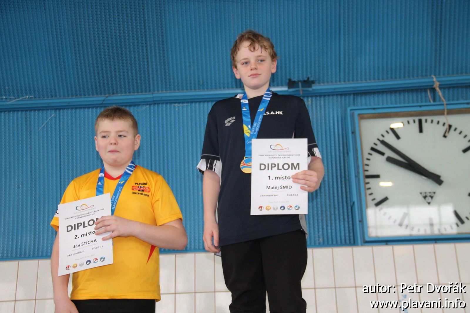 Hned ráno si to o tituly rozdali plavci nejmladší kategorie 12-letých žáků a žaček. Po třech kilometrech mohli zlatou medaili slavit Matěj Šmíd a Karolina Kertész (oba ESA Hradec Králové).