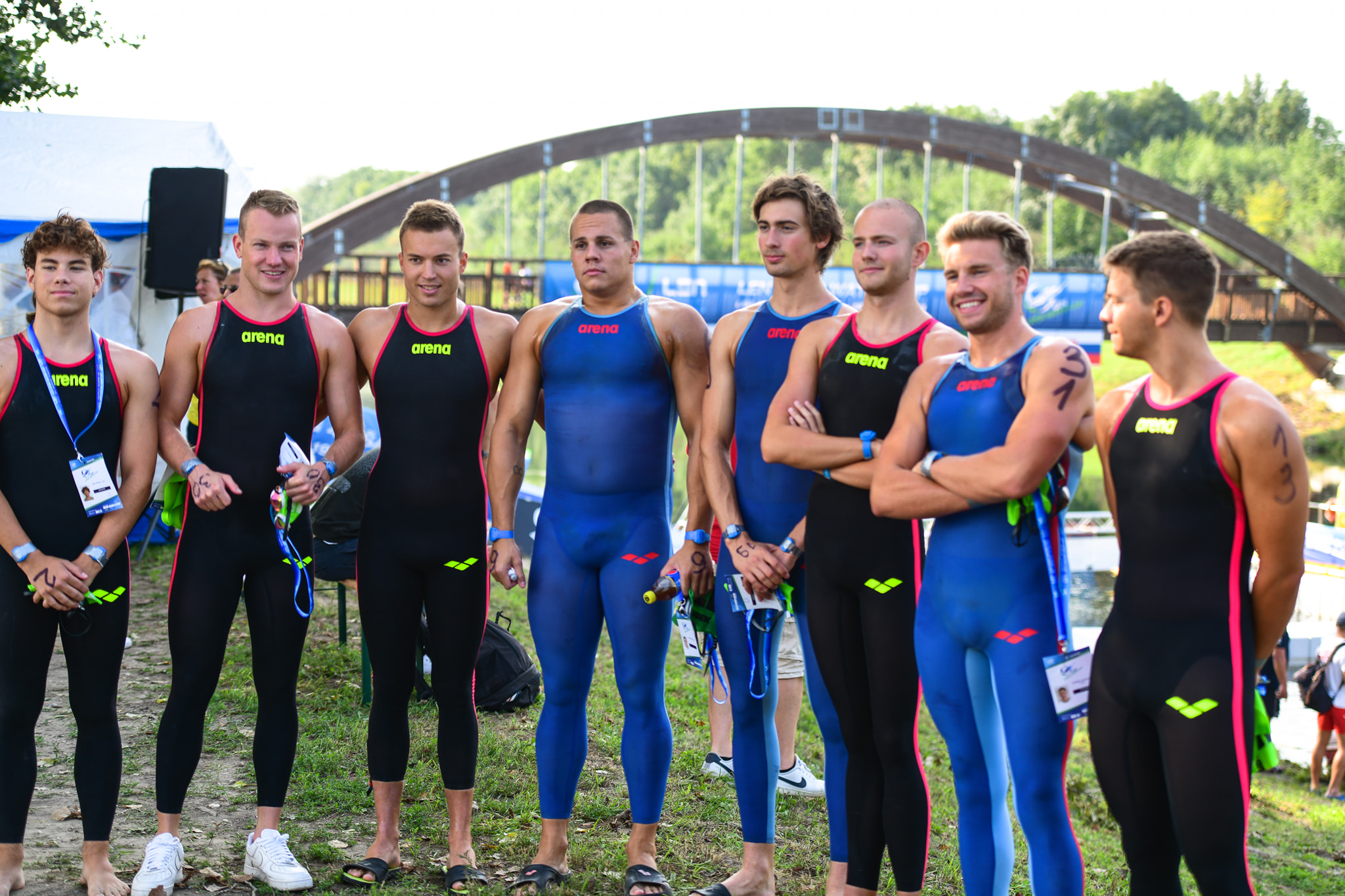 Na kanálu hned vedle známého hotelového a sportovního komplexu X-Bionic® Sphere odstartovali do svého závodu nejdříve muži. Čekalo na ně 10 kilometrů rozdělených do šesti 1667 metrů dlouhých okruhů a také náročnější podmínky v podobě studené vody, jejíž teplota jen těsně přesáhla hranici 18 stupňů, pod kterou už by byly povinné neopreny. Z české osmičky na startu si nejlépe vedl Matěj Kozubek, který sice na dohmatu prohrál s úřadujícím evropským šampiónem na 25 km Mario Sanzullem, ale i tak si připsal výbornou pátou příčku. Na začátku druhé desítky dokončili závod Vojislav Štěrba (11.) a Martin Straka (12.), sedmnáctou pozici bral Ondřej Zach, o místo za ním skončil Denis Borovka. Ve třetí desítce se umístili Adam Rak (23.) a Tadeáš Neliba (24.), poslední český plavec Jan Carda vzdal ve druhém okruhu kvůli problémům s ramenem.