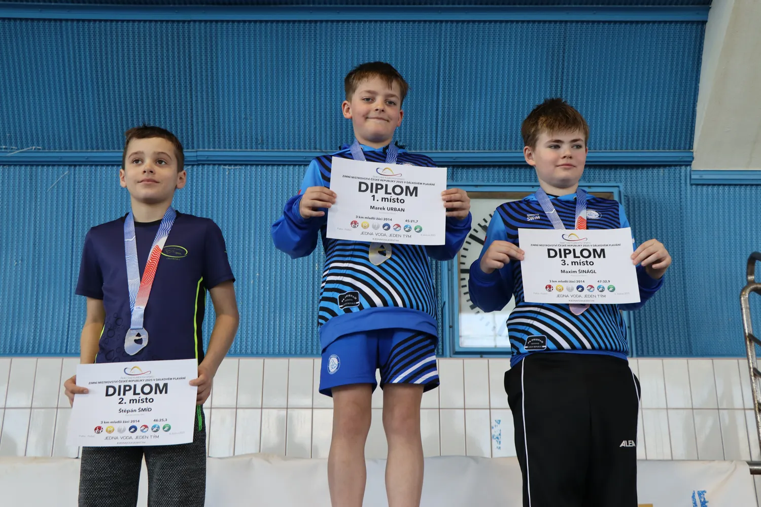 V první ranní kombinované rozplavbě se rozdávaly medaile mezi mladším žactvem ročníku 2014. Šlo o jedinou kategorii, kde se plavalo na kratší distanci 3 kilometry. V závodě žaček se představila sice pouze čtveřice startujících, přesto bazénová hala zažila pořádné drama. O jedinou desetinu si pro zlato doplavala Zoe Zůmová (KIN České Budějovice) před Natálií Bednářovou (Lokomotiva Trutnov). Obě závodnice absolvovali celý závod bok po boku. To je ve čtyřech plavkyních na jedné dráze ne úplně výhodný průběh závodu, přesto ani jedna ze soupeřek nedarovalo té druhé ani centimetr místa a v cíli společně s rozhodčími rozhodovala i cílová kamera. Třetí místo brala Veronika Kočí (PK Příbram). Stejně staří žáci si rozdali medaile o něco méně dramatickým způsobem. Zvítězil Marek Urban (PK Příbram) o minutu před Štěpánem Šmídem (ESA Hradec Králové) a o další minutu zpět byl Maxim Šinágl (PK Příbram), ten jediný musel o svou medaile více bojovat, na čtvrtého Jindřicha Bečičku měl náskok pouze 8 vteřin.